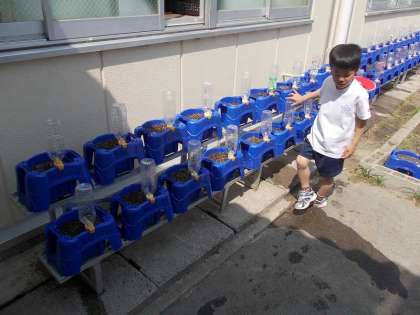 チューリップを育てていた一人一鉢で,新しい植物を育てています。早速水やりをして世話をしています。暑くなってきました。元気に育つために,しっかり世話をして観察してくださいね。