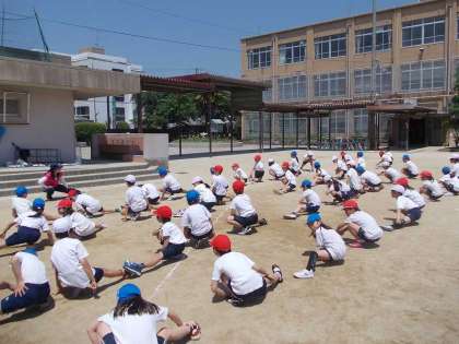 PTAのベルマークで運動会用の青帽子を買っていただいていました。この日初めて配ってもらいました。好天の体育時に青帽子はよく似合っていました。この青帽子は運動会まで青組の子どもに貸し出します。