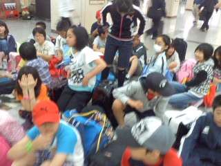 バスの車内と新幹線を待っている様子の写真です。予定通り新幹線に乗りました。全員元気にしているということです。
