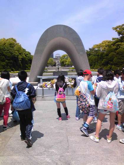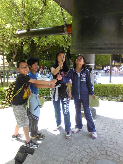 平和集会の後は,お弁当を食べてから班で石碑巡りをしています。被ばくアオギリも回りました。保護者の皆様に朝早くから作っていただいたお弁当を,感謝して食べたそうです。