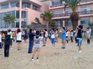 みさきの家・山の家での宿泊学習時と同じように,朝のプログラムは体操から始まりました。海を目の前にしての体操は,修学旅行に来ていることを実感させてくれました。