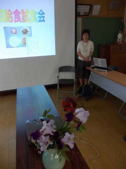 今年もPTAの役員の方々の協力を得て,6年生が修学旅行に行っていて喫食人数が減る5月15日に実施しました。PTAと教頭先生の挨拶の後,本校の得丸栄養教諭から,給食について説明いたしました。