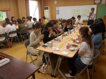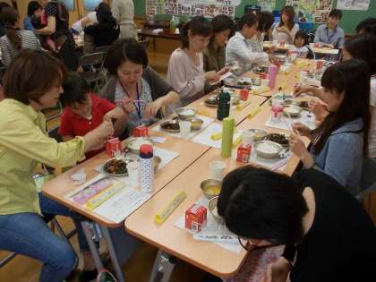 子ども達と同じ献立の給食を,ふれあいサロンで食べていただきました。食缶食器の返還は,PTA役員の方にしていただきました。