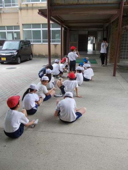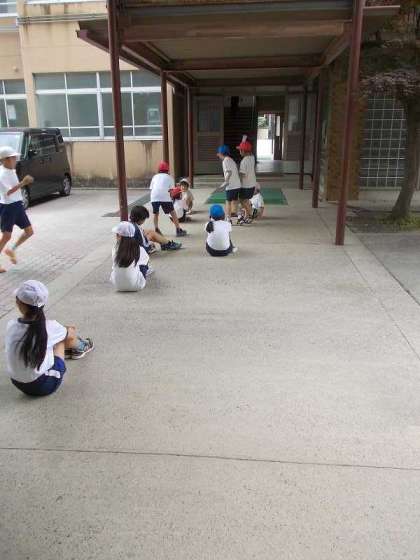 掃除時間が終わって渡り廊下で体育座りの児童がいました。並ぶ順番を意識して,先生が来る前に自分の位置に座っていたのでした。