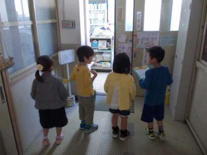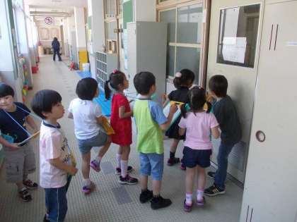 先日は2年生に案内してもらった学校探検を,今日は1年生だけでしました。教室配置図には,入ってもよい部屋に○がついていましたが,まだ全部ひらがなも習っていないのでなかなか大変そうでした。