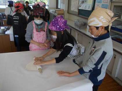 修学旅行で『うどん学校』で修行してきた6年生は,『うどん学校』でふんだものを,この日まで熟成させていました。続きを得丸先生もお手伝いして頂き,家庭科室で…ということになりました。