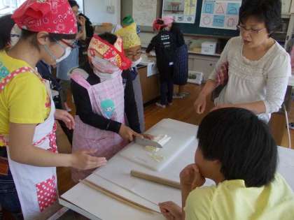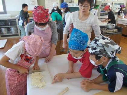 修学旅行で『うどん学校』で修行してきた6年生は,『うどん学校』でふんだものを,この日まで熟成させていました。続きを得丸先生もお手伝いして頂き,家庭科室で…ということになりました。