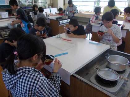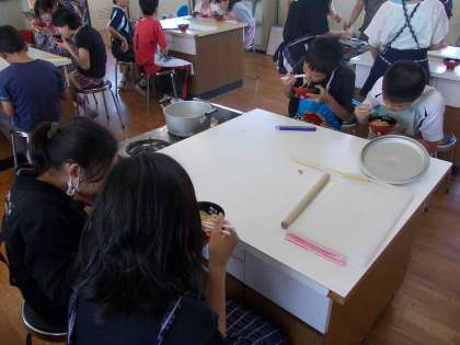 釜揚げにして濃縮出汁につけて食べました。給食のことを考えてうどんを少量にしたので,少し辛く感じたようでした。太さが不揃いでしたが,自分達が作ったうどんを仲間と一緒に食べる味は格別のようでした。