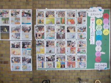 玄関に読み聞かせの様子をお伝えしている掲示板があります。平成24年度に行った読み聞かせを掲示してきましたが,平成25年度の読み聞かせを始めていただいたので,全て外すことにしました。
