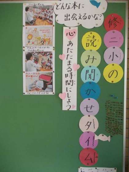 まだ余白の部分が多い掲示板ですが,これからどんどん読み聞かせの様子をお伝えします。学校にお立ち寄りの折りには,玄関の読み聞かせ掲示板をご覧ください。