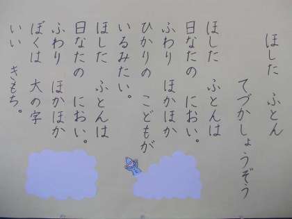 陽射しが強くなり,布団を干すとよく乾くでしょうね。真夏なら布団が熱くなって寝苦しさを感じるかもしれませんが,夜は少しひんやり感じる今頃がこの詩の季節でしょうか。南校舎1階洗面所前に掲示してあります。