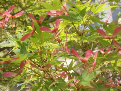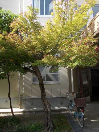 中庭にイロハカエデの木が2本あります。2本とも実をつけていますが,葉の色にはずいぶん違いがあります。秋には見事な紅葉を見せてくれる木の新緑の季節の様子です。