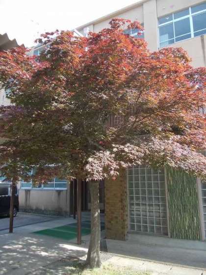 中庭にイロハカエデの木が2本あります。2本とも実をつけていますが,葉の色にはずいぶん違いがあります。秋には見事な紅葉を見せてくれる木の新緑の季節の様子です。