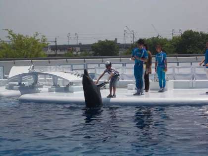イルカショーの中で,インストラクターのお姉さんに選んでもらった2人だけが,イルカと握手できることになりました。修二校の子ども達は一斉に手を挙げたところ,見事S君が選ばれました。