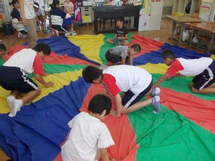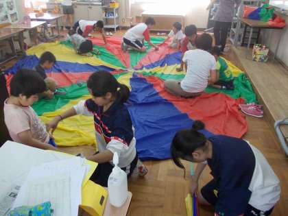 運動会ではにほ組が5年生と共に使ったバルーンをきれいにしています。チャレンジ体験の中学生も,気持ちよく動いて手伝ってくれました。