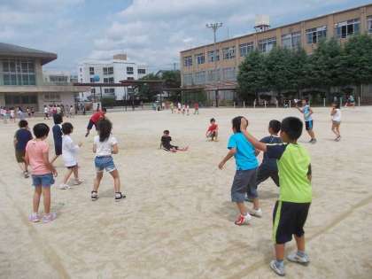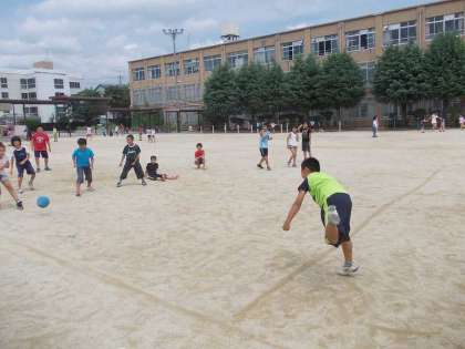 5年生が運動場のど真ん中でみんな遊びのドッジボールをしていました。少し湿度を感じましたが,暑くもなく爽やかな気候でした。