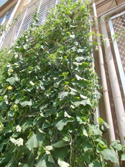 今年初めて緑のカーテンで育てているヒョウタンが,実をつけていることがわかるようになりました。どこにあるか探してみてください。1つや2つではないので,数を数えても楽しいですよ。