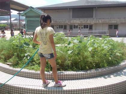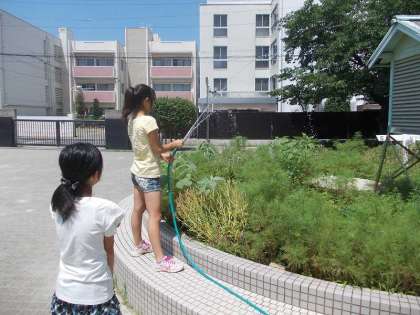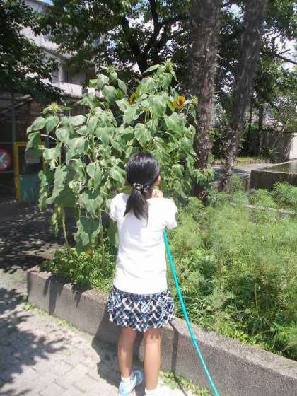 暑い日が続いています。今日の当番の5年生は忘れずに水やりをしてくれました。1週間に一度の当番をすると,植物の成長・季節の移り変わりに気がつきます。先週の月曜日には,まだヒマワリは咲いていませんでしたからね。