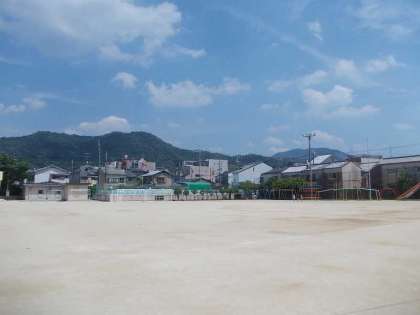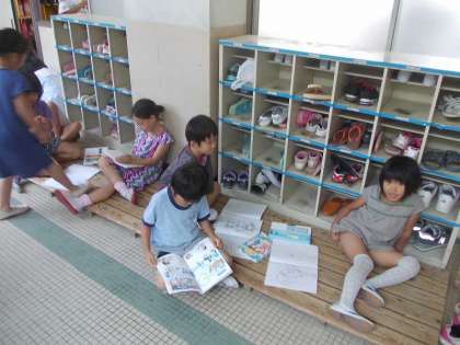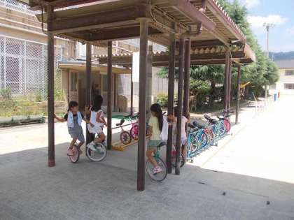 掃除時間にも太陽が容赦なく降り注いでいました。1年生は遊べるのですが,多くの1年生は,日陰のところで一輪車に乗ったり,教室前のスノコでお絵かきをしたりしていました。ほんの数人は遊具やブランコの所で遊んでいました。