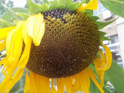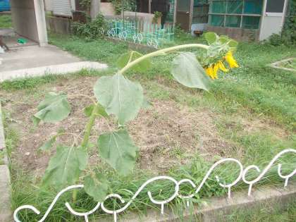 6年のヒマワリは背が低いのですが大きな花が咲き,重そうに首を曲げています。そのため,花やタネのでき方が観察しやすくなっています。