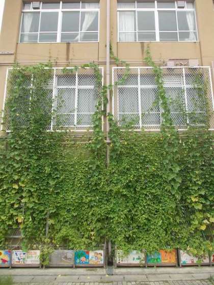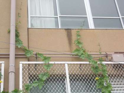 みどりのカーテンは順調に生育しています。3階の図工室の窓まで届きました。これ以上大きくなると,収穫するのが大変になります。