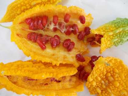 熟すと赤くなってしまうのがツルレイシのタネ。ここまで熟したら野菜炒めにはできませんが,タネを食べると甘いそうです。正確に言うと,タネの周りが甘いのです。甘いと鳥に食べてもらって,タネを遠くまで運べます。