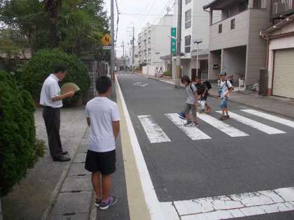 週明けの登校の様子です。中学校は夏休みに入っています。小学校ももうすぐ夏休みです。高学年の児童が,自主的に校門挨拶運動を続けてくれています。