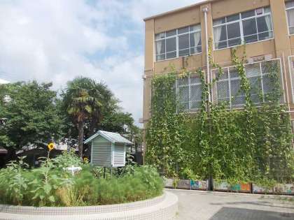 みどりのカーテンが校舎を覆い,ヒマワリが真夏を告げています。昨夕に夕立があったのですが,葉からの水分の蒸散が激しいようで,葉は下を向いていました。