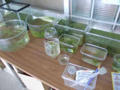 夏休みを前に,5年生の教室で飼われていたメダカが,玄関に引っ越してきました。5年生の南校舎3階が高温になるのと,エサや水の管理のための処置です。
