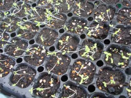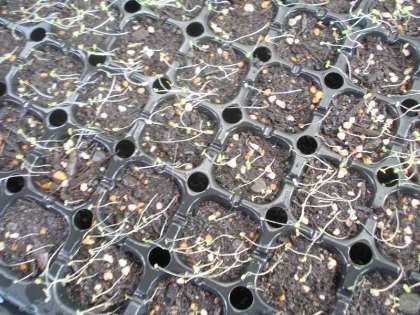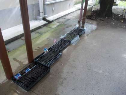 台風に備えて苗箱を校舎内に避難させていました。台風が去ったので校舎外に出しました。発芽した芽がもやしのように長くなっていました。
