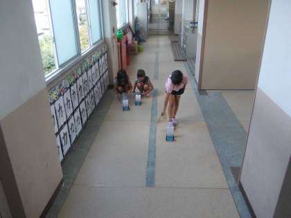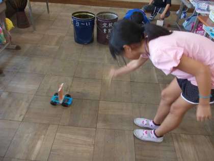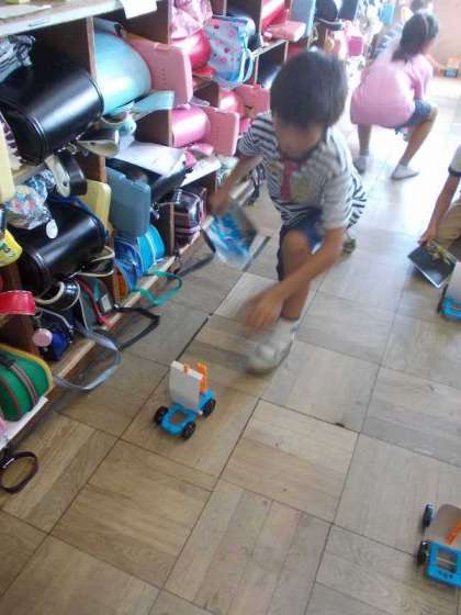 3年生の理科では,風をエネルギーととらえる学習をします。まずは,風受けのついた車で遊びながら,風の力を感じました。次の時間に,風の強さ・風受けの大きさを決めて,実験をすることになります。