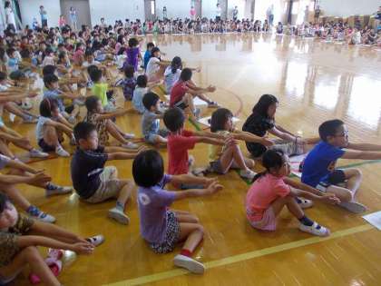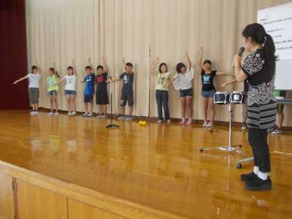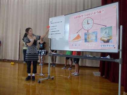 6年生の計画委員・代表委員が手伝ってくれる中,井上先生から『3時のおやつの内容は』という楽しい音楽リズム遊びを紹介してもらいました。