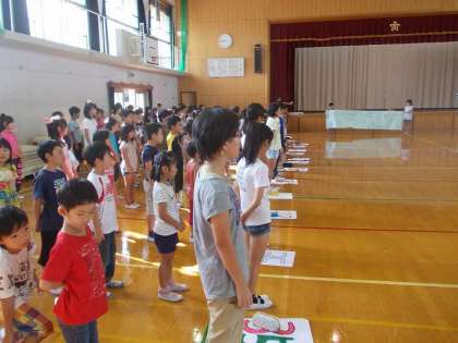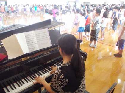 児童朝会では,6年生のリーダーを先頭にして,たてわりグループで並びます。5年生の司会で,いつものようにまず『ぼくらのふるさと一乗寺』を全校で合唱しました。