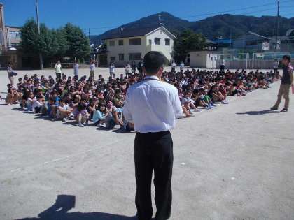 雲一つない快晴でした。静かに集合して点呼を受けた後,山口先生と校長先生のお話を聞きました。