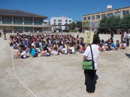 避難訓練 〜運動場でお話を聞きました〜