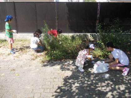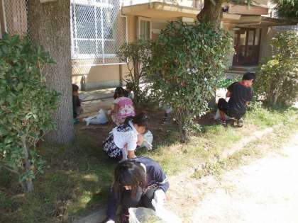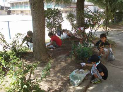 秋に運動会が行われていた頃からの伝統行事です。夏の間に育った雑草を,たてわりグループで協力してやっつけました。10時から10時半までの30分間で,本当にきれいになりました。児童の皆さんありがとうございました。6年生のリーダーの皆さん,ご苦労様でした。