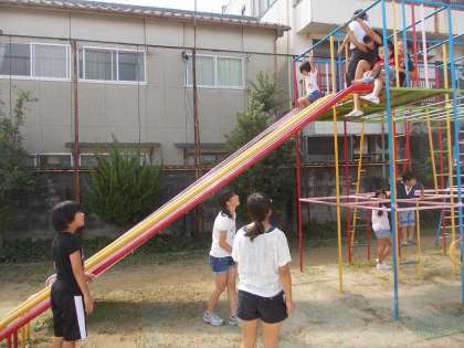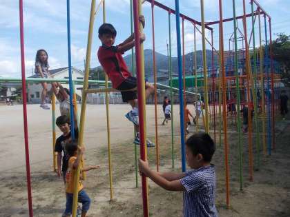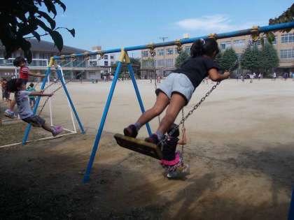 好天に恵まれて,中間休みに楽しく遊具で遊びました。