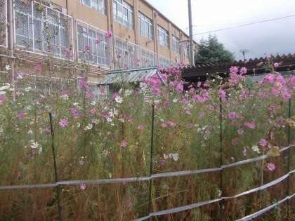 ロータリーのコスモスが満開を迎えました。背が高くなり,風が強い日が多かったので,倒れないように支えをしています。
