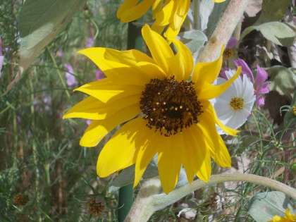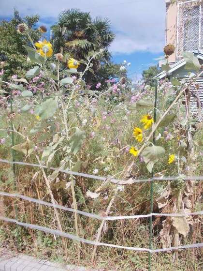 10月ですが,晩生のヒマワリがまだ咲いています。一本のタネからたくさんの花をつける「スプレー咲き」の品種は,夏休みが終わってから咲き始めました。