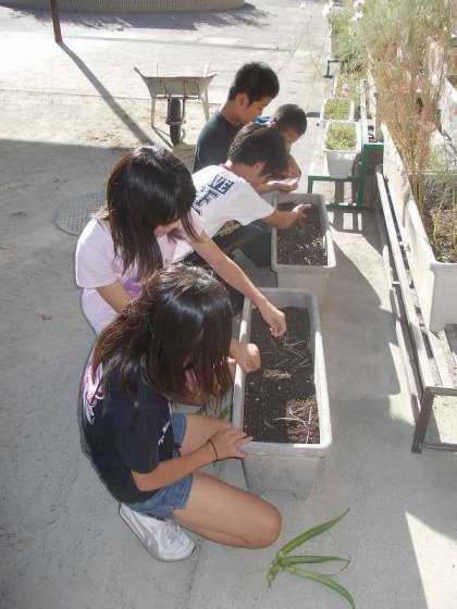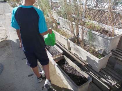 花菜は昨年度も育てたのですが,今年は紫色の花をつける花菜のタネが手に入ったので,委員会の6年生に植えてもらいました。うまく育つと3月に花が咲くそうです。卒業前に花を見てほしいと思っています。