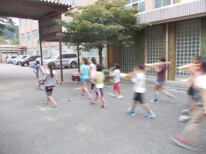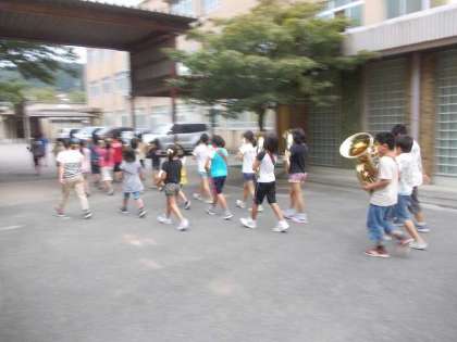 写真は,中庭でドリル演奏をしている様子です。写真では明るく見えるかもしれませんが,薄暗くなってきています。そのため,子ども達が歩くと写真が流れています。