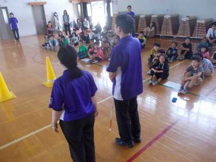 授業の後半は,視覚障がい者の方に手引きの仕方を教えてもらい,実際に体育館で手引きをしました。相手の立場に立って考えたり行動したりすることの大切さについて学びました。