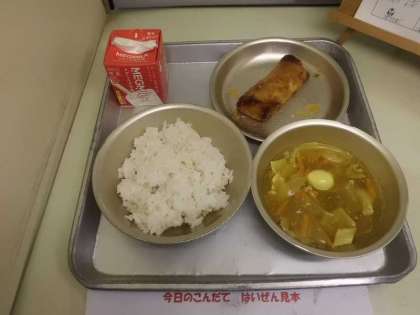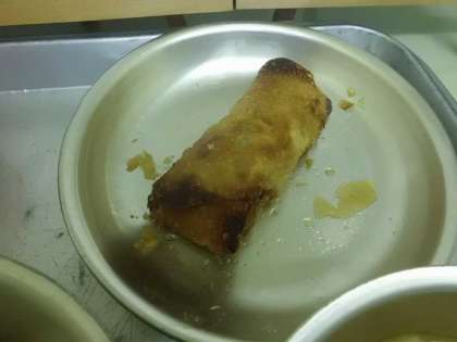 給食室では春巻ができあがりました。お皿に載せてサンプルケースに配膳見本として飾り,給食当番の到着を待っています。