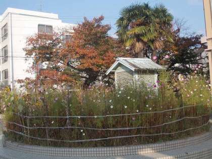 手前の花壇では,名残のコスモスの花が咲いています。11月11日の委員会活動で抜く予定です。タネもたくさんできていますので,欲しい人は自由にお持ち帰りください。