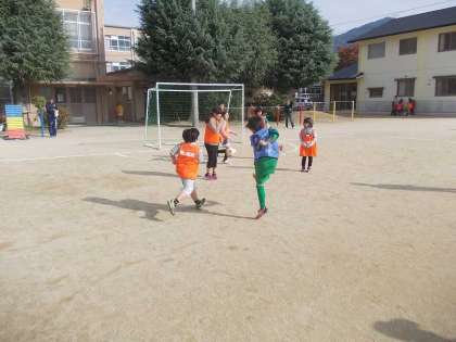 両チーム7名ずつの14名がボールを追っています。審判は,畠澤先生・教頭先生と子ども会の出水会長さんでした。