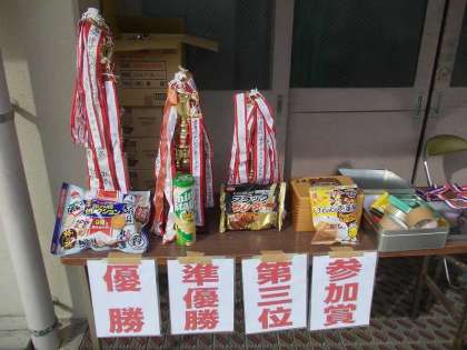 対戦の組み合わせは,予め抽選で決まっていました。優勝・準優勝・3位には,トロフィー・賞状・メダルが授与され,副賞のお菓子も豪華なものが準備されています。