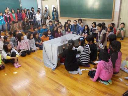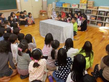 2人の先生が別々のグループを指導して,二つのお話をペープサートで表現しました。子ども達は英語で,先生が日本語で解説をしながら発表しました。