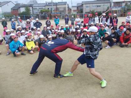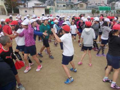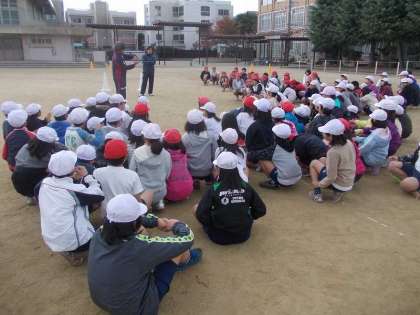 お昼からは高学年がお世話になりました。すぐにサッカー教室が始まると思っていたでしょうが,身体ほぐしの運動や,チームワークを高めるスキルをたくさん教えていただきました。