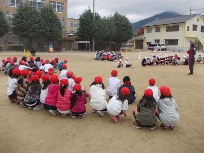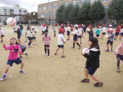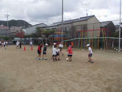 中間休みの後は中学年がお世話になりました。ハイタッチ競争の後に,ボールの扱いを覚えるためのキャッチボールもしました。チームを作って自分達でサッカーを楽しむことを教えてもらいました。