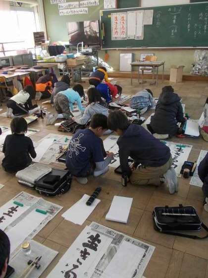 1月10日に,4年い組は生活科室で,4年ろ組は教室で書き初めをしました。画仙紙大のお手本をなぞって文字の大きさとバランスを知ってから,画仙紙に書きました。机の上では書きにくいので,床で正座をして書きました。